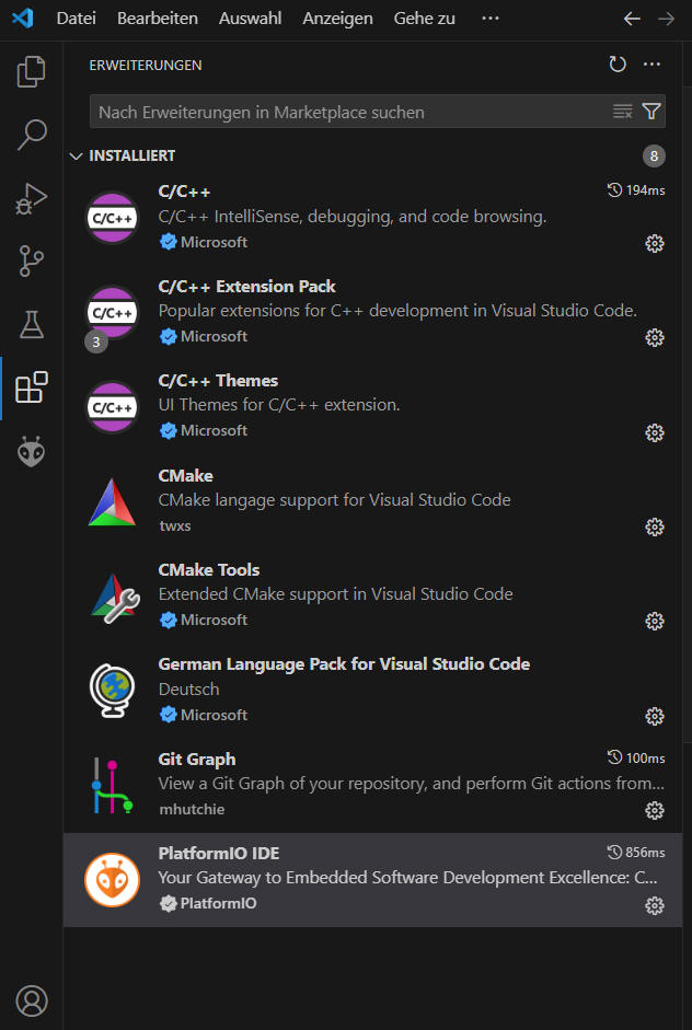 Modul PlatformIO installiert, um die sehr gut verfügbaren und gut dokumentierten Arduino-Libraries für