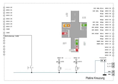 Diese symbolisierte Kreuzung wird auf einer Leiterplatte aufgebaut. Die Verbindung nach außen erfolgt durch Schraubklemmen und Stiftleisten, so dass unterschiedliche Steuereinheiten angeschaltet werden können.