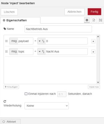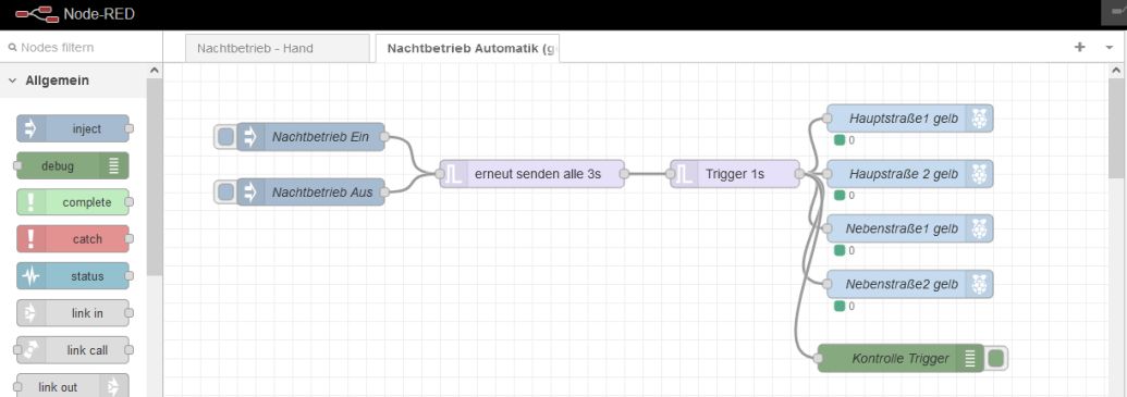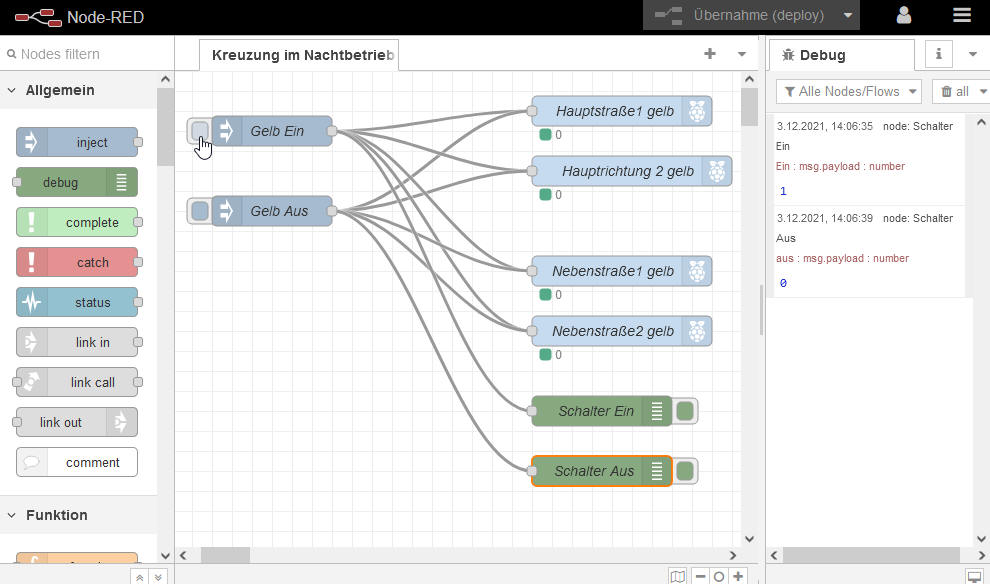 Zunächst wird das "gelb blinken" (Nachtbetrieb) der Signalgeber durch einfache Eingabetasten simuliert. Zusätzlich wird ein Debug-Node eingefügt.