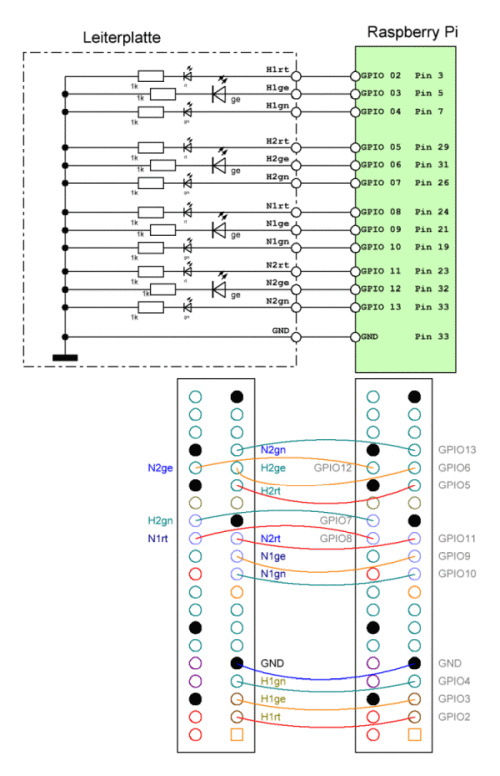 Für den Nachtbetrieb mussten bisher nur die gelben LEDs verdrahtet werden. Nun kommen alle roten und grünen Anzeigen hinzu.