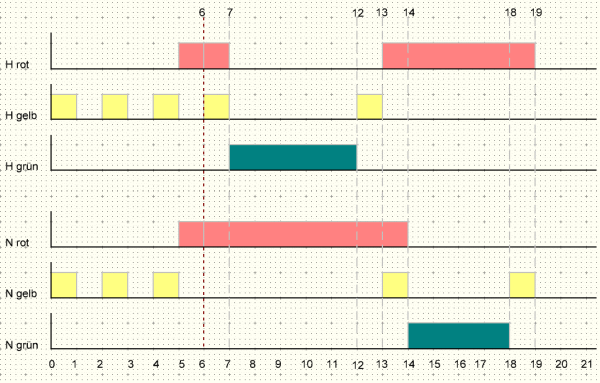 Richtungen auf rot geschaltet. Das Programm für die Hauptstraße schließt sich direkt an die Einschaltphase an.