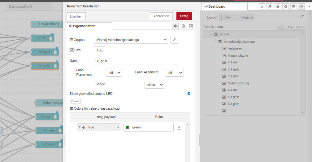Am Beispiel der grünen LED ist der Einsatz der Dashboard-Nodes dargestellt.