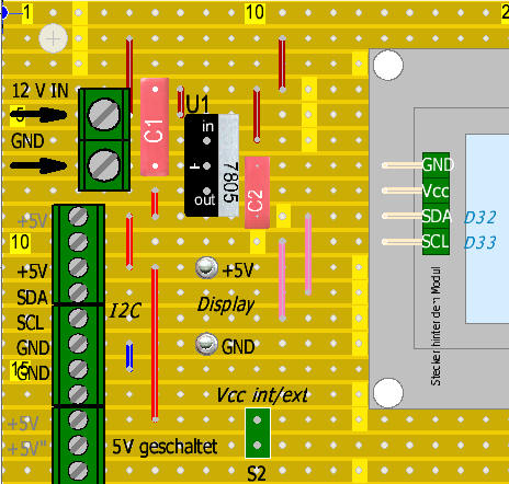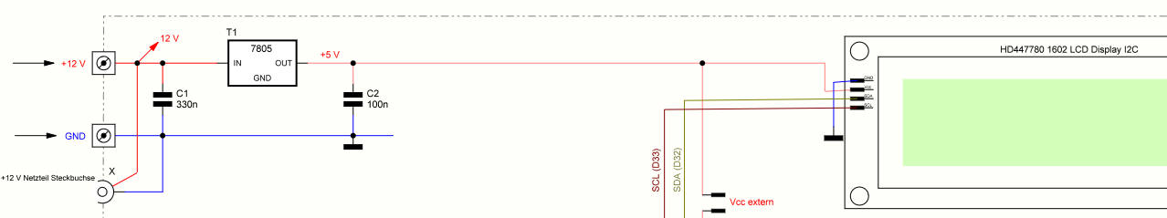 ACHTUNG: Diese erste Konstruktionsplanung musste nochmals überarbeitet werden. Der Grund dafür ist die verwendete Versorgungsspannung für das Display. Mit Vcc=5 V würden auch die Signale auf den I2C-Leitungen mit 5 V - Signalen ausgesteuert, was wiederum den Eingängen des ESP32 dauerhaft schaden würde!