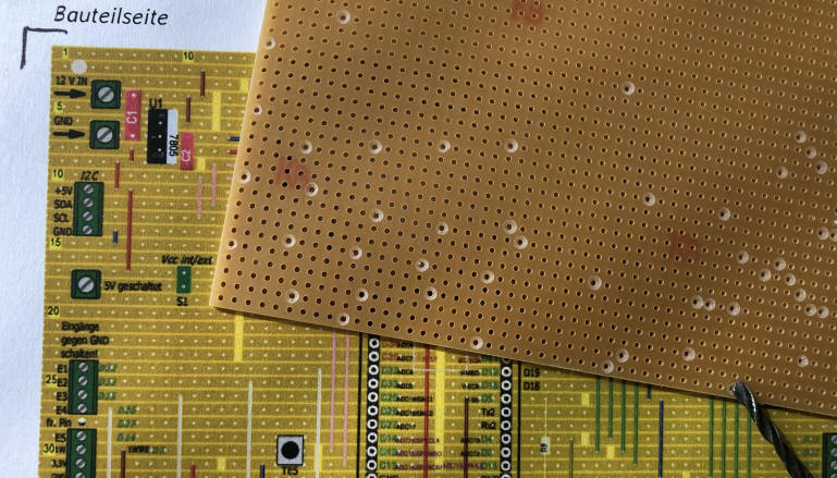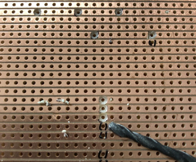 die Durchsteckpunkte für die Brücken und Widerstände leicht mit einem Handbohrer