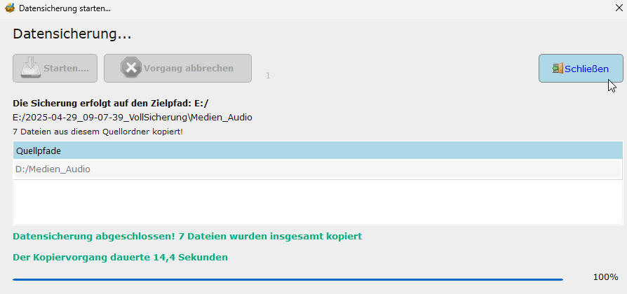SIcherung beendet mit Anzeige der gesicherten Dateianzahl und der Zeit: