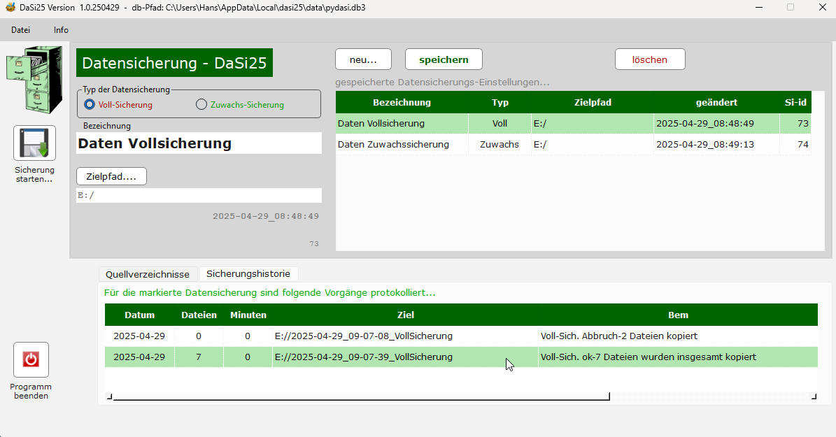 Beim Zurückkehren zum Hauptfenster wird unten das Sicherungsprotokoll in die